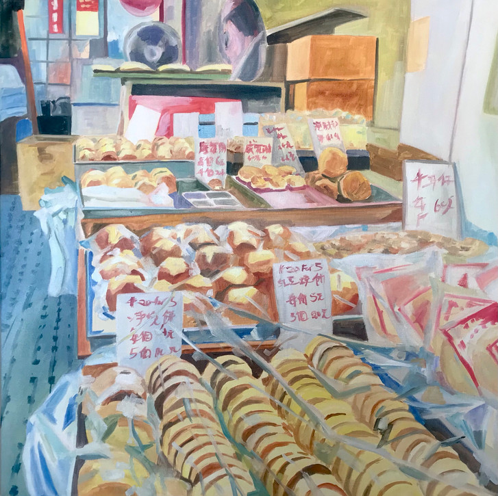 Recollection is a series of paintings that explore my identity as a “Hong Konger” and a commentary on the unsettling situation of my home. Commonplace in Hong Kong, such as restaurants and street markets, stand as symbols to politically sensitive events that have happened over the years. Imagining people under such political instabilities, many of them are forced to censor themselves and cloak their true beliefs. Eventually, someone as modest as a fruit seller may need to seek cover behind a painted mask or see themselves disappear entirely.